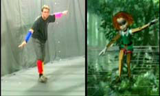 運用三個網絡攝像頭提取真人輪廓數據,創作三維動畫化身。我們使用經過特殊加工的彩袖,進行實時動態捕捉。
