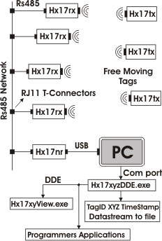 HX17網絡由三個基本組件構成,包括hx17rx超聲波接收器、hx17tx超聲波標簽、hx17nr網絡讀取器。HX17nr能夠同步網絡并收集標簽的ID以及超聲波信號的發射時間。數據通過USB端口傳送到電腦等讀取設備中。系統附帶的光盤程序可以計算并存儲標簽位置,并可通過直接數據交換軟件界面將處理過的實時數據提供給程序員使用。以直接數據交換傳送的數據串包含標簽ID、XYZ位置(以毫米為單位)、時間戳記、記錄編號以及哪些接收器檢測到了標簽的超聲波ID。Hexamite配有平面瀏覽程序用于演示。